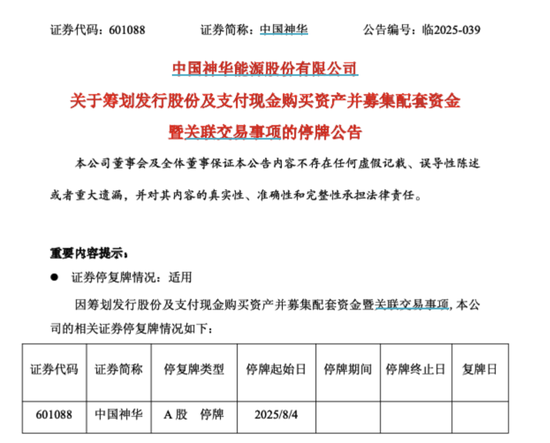 8月1日晚,中国神华公告称,公司当天收到控股股东国家能源投资集团有限责任公司(以下简称“国家能源集团”)的《关于筹划重大事项的通知》,初步考虑拟由公司发行股份及支付现金购买国家能源集团持有的煤炭、坑口煤电以及煤制油煤制气煤化工等相关资产并募集配套资金(以下简称“本次交易”或“本次重组”)。根据《上市公司重大资产重组管理办法》等相关法律法规的规定,本次交易构成关联交易,预计不构成重大资产重组,本次交易不会导致公司实际控制人变更。